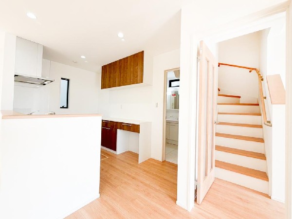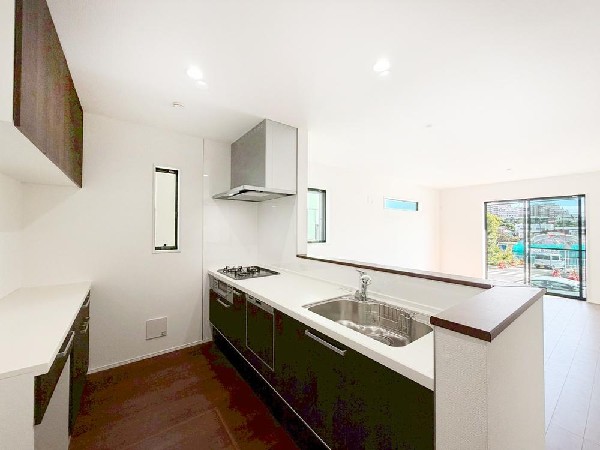 | 設備 | 都市ガス、公営水道、下水、駐車場1台、南側道路面す、前道6m以上、始発駅、2沿線以上利用可、中学校徒歩10分以内、公園5分以内、コンビニ5分以内、対面キッチン、パントリー、都市ガス、システムキッチン、ガス3口、対面キッチン、食器洗浄機、I型キッチン、パントリー(食器・食品の収納庫)、ユニットバス、追い焚き、ウォシュレット、トイレ2ヶ所、浴室に窓、暖房便座、バルコニー、南面バルコニー、2階建、LDK15畳以上、省エネ給湯器、全室2面採光、全室フローリング、リビング階段、クローゼット、収納、床下収納、全居室収納、シャンプドレッサー付き、モニタ付きインターフォン、ペアガラス、全居室複層ガラスか複層サッシ、24時間換気システム、建物10年保証 |