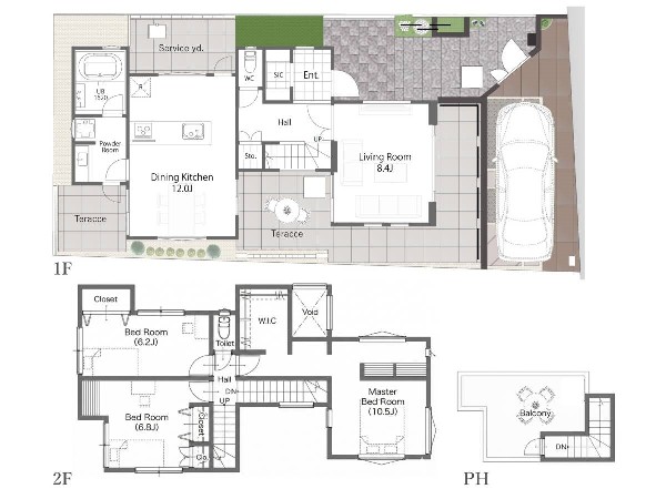 江田駅徒歩8分 広々スカイバルコニー ダイニングとリビングの間に中庭を配置 10.5帖の主寝室はWIC付