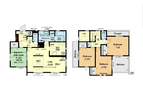 設備 | 都市ガス、公営水道、下水、防犯シャッター、吹き抜け、外壁サイディング、駐車場2台以上、緑豊かな住宅地、閑静な住宅地、土地50坪以上、小学校徒歩10分以内、中学校徒歩10分以内、保育施設・幼稚園5分以内、公園5分以内、対面キッチン、都市ガス、システムキッチン、ガス3口、対面キッチン、I型キッチン、ユニットバス、追い焚き、ウォシュレット、トイレ2ヶ所、浴室に窓、暖房便座、バルコニー、バルコニー2面、南面バルコニー、2階建、LDK18畳以上、和室、採光2面、全室2面採光、フローリング、クローゼット、収納、床下収納、下駄箱、全居室収納、シャンプドレッサー付き、フラット35Sに対応、モニタ付きインターフォン、インターフォン、24時間換気システム、建物10年保証、勾配天井 |