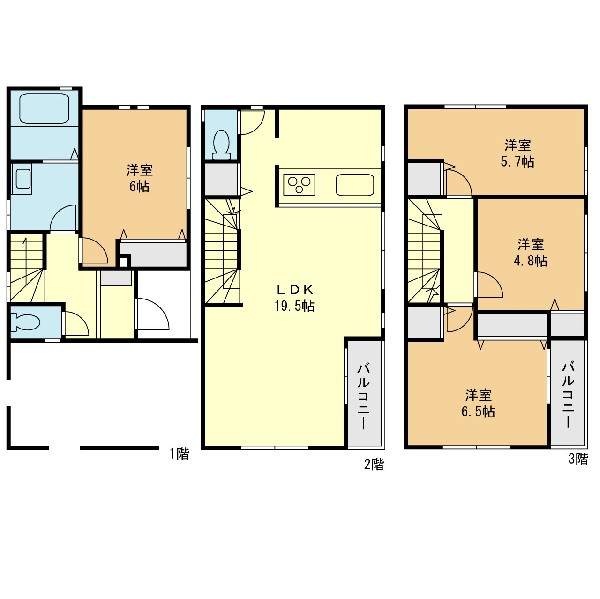 設備 | 個別LPG、公営水道、下水、ビルトインガレージ、整形地、緑豊かな住宅地、閑静な住宅地、平坦地、角地、前道6m以上、2沿線以上利用可、小学校徒歩10分以内、対面キッチン、システムキッチン、対面キッチン、食器洗浄機、I型キッチン、ユニットバス、浴室乾燥機、トイレ2ヶ所、浴室に窓、バルコニー、3階建以上、LDK18畳以上、フローリング、リビング階段、クローゼット、収納、床下収納、下駄箱、全居室収納、シャンプドレッサー付き |