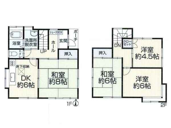 | 設備 | 公営水道、下水、スレート葺、駐車場1台、閑静な住宅地、角地、都市近郊、前道6m以上、市街地が近い、2沿線以上利用可、小学校徒歩10分以内、中学校徒歩10分以内、公園5分以内、コンビニ5分以内、ユニットバス、浴室に窓、バルコニー、バルコニー2面、南面バルコニー、内装リフォーム、外装リフォーム、2階建、和室、南向き、全室2面採光、収納、床下収納、下駄箱、火災警報器、通風良好、陽当り良好 |