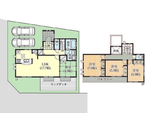 | 設備 | 都市ガス、公営水道、下水、駐車場2台以上、緑豊かな住宅地、閑静な住宅地、角地、スーパーが近い(10分以内)、中学校徒歩10分以内、公園5分以内、コンビニ5分以内、対面キッチン、都市ガス、システムキッチン、ガス3口、対面キッチン、I型キッチン、ユニットバス、ウォシュレット、浴室に窓、バルコニー、ウッドデッキ、ワイドバルコニー、2階建、LDK15畳以上、和室、全室南向き、フローリング、クローゼット、収納、床下収納、下駄箱、全居室収納、モニタ付きインターフォン、インターフォン |