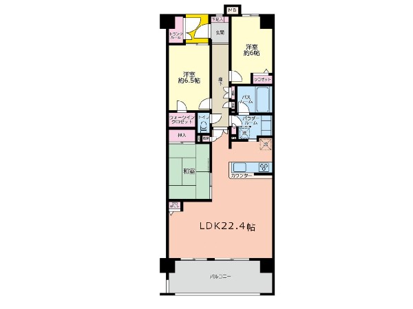 | 設備 | 都市ガス、公営水道、下水、エレベータ、緑豊かな住宅地、閑静な住宅地、都市ガス、システムキッチン、ガス3口、カウンターキッチン、対面キッチン、I型キッチン、ユニットバス、バルコニー、全居室6畳以上、フローリング、クローゼット、ウォークインクローゼット、押し入れ、収納、下駄箱、全居室収納 |
